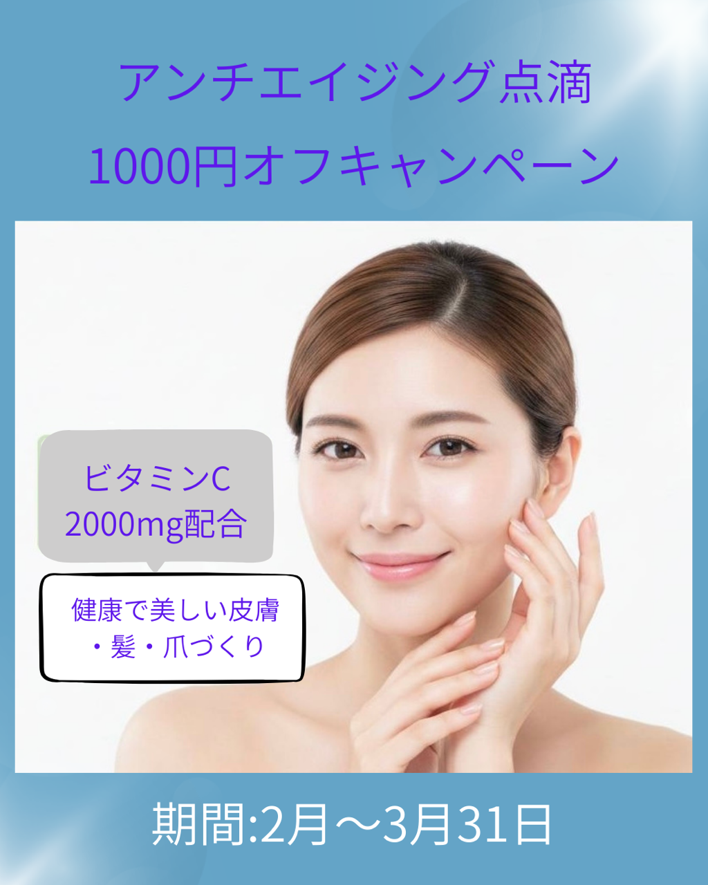 アンチエイジング点滴およびアンチエイジングW点滴が2月1日から3月31日までキャンペーン価格となっております。